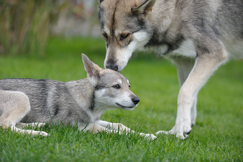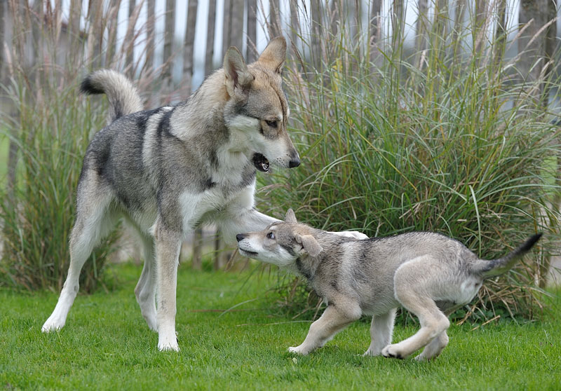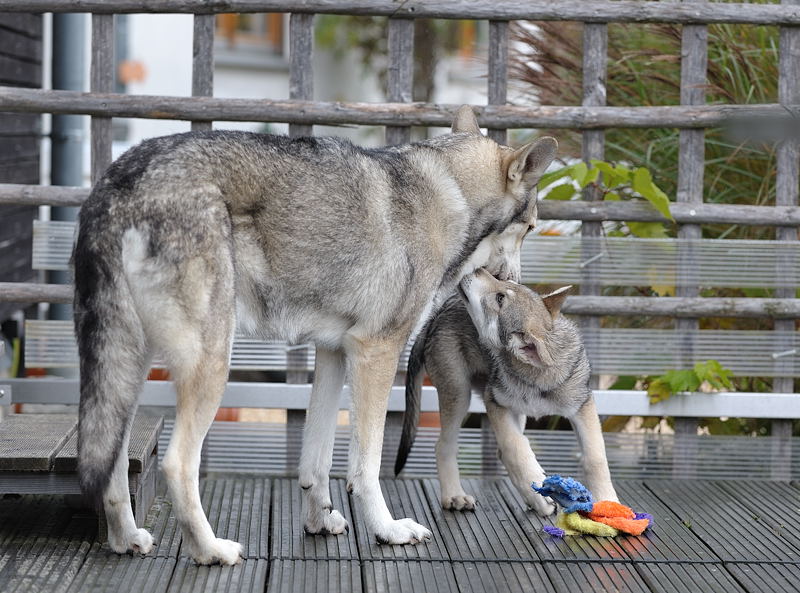 Mitte Oktober war die 10 Wochen alte Nimueh (Avalon Nimueh of Wolf Temper) zu Besuch. Sie ist ein kleines taffes Mädchen, sehr fröhlich und auch mitteilungsbedürftig (sie begrüßt lautstark und feuert auch ihren Spielpartner gerne laut an ;) ) und hatte unser Rudel schnell um die süßen Pfoten gewickelt. Die "Alten" - Nisha und Yuma - hatten nicht viel Interesse an der kleinen Brut, aber dafür Shaya umso mehr, die sehr schön mit der frechen Kleinen gespielt hat. Nimueh hatte schnell raus, wie man Shaya ärgern kann :))) . Anfangs hat sie sich noch unter dem Tisch versteckt, wie im Bild links zu sehen - aber das hat kaum 5 Minuten gedauert und schon hat sie ihr "wahres Gesicht" gezeigt und Shaya das Fürchten gelehrt....