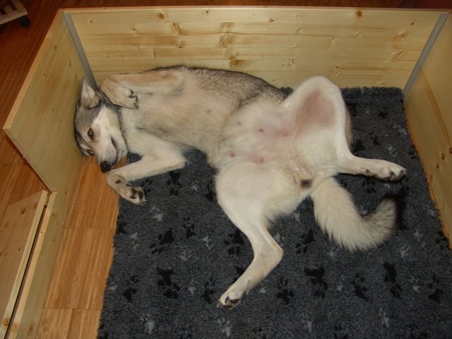 Nisha fühlt sich schon sehr wohl in der Wurfkiste und ist völlig entspannt. Ihr kleines Bäuchlein wächst nun täglich :) .