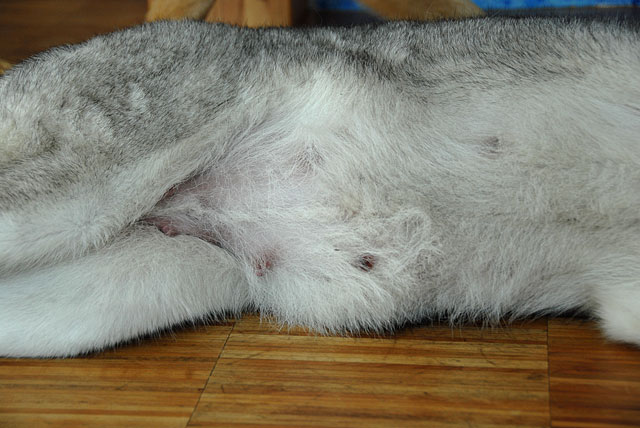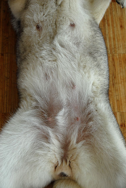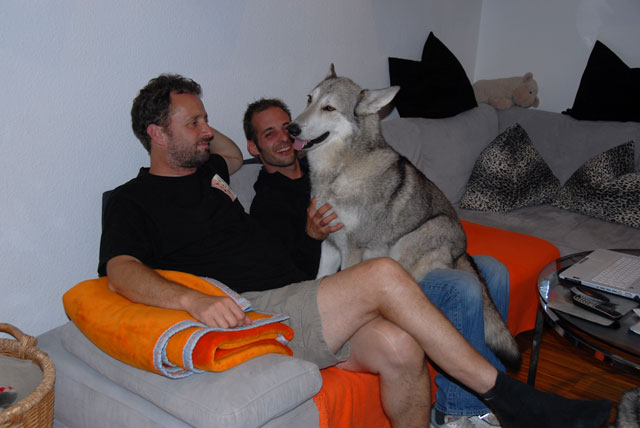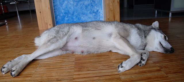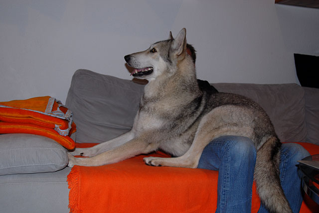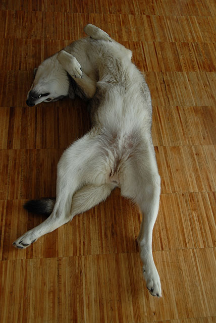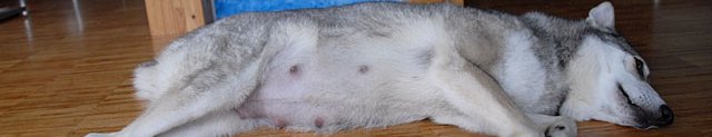 Nisha ist inzwischen in der 8. Woche ihrer Trächtigkeit. In diesem Album sind Photos ab Anfang der 6. Woche zusammengefaßt. Als erstes zum Vergleichen eine Collage von Photos, die im Abstand von jeweils ca. 1 Woche entstanden sind: ganz links Nisha's Babybauch am 35. Tag der Trächtigkeit, in der Mitte am 43. Tag und rechts aktuell am 51. Tag. Nisha hat seit dem Decken knapp 6 kg zugenommen. Ihr Appetit war bisher immer sehr gut, auch sonst verlief die Trächtigkeit bisher absolut komplikationslos. Nisha ist sehr faul und bewegt sich nur so viel wie nötig. Dennoch gehen wir täglich mehrmals spazieren, zwei kleinere Runden und eine größere Runde von mind. 1 h. Sie genießt es sehr, wenn wir ihren Babybauch streicheln. Die ersten Welpenbewegungen sind seit 3 Tagen zu spüren und zu sehen - ein fantastisches Gefühl!! Es ist unwahrscheinlich schön zu spüren, wie die Babys ganz sanft an der aufgelegten Hand vorbeistreichen. Etwas Milch kommt auch seit einigen Tagen aus den Zitzen. Die Wurfkiste haben wir schon aufgestellt und Nisha liegt sehr gerne darin und wühlt intensiv in den darinliegenden Bettlaken. Nun heißt es noch etwa knapp 2 Wochen abwarten, bis die Babys geboren werden. Eine sehr spannende Zeit!